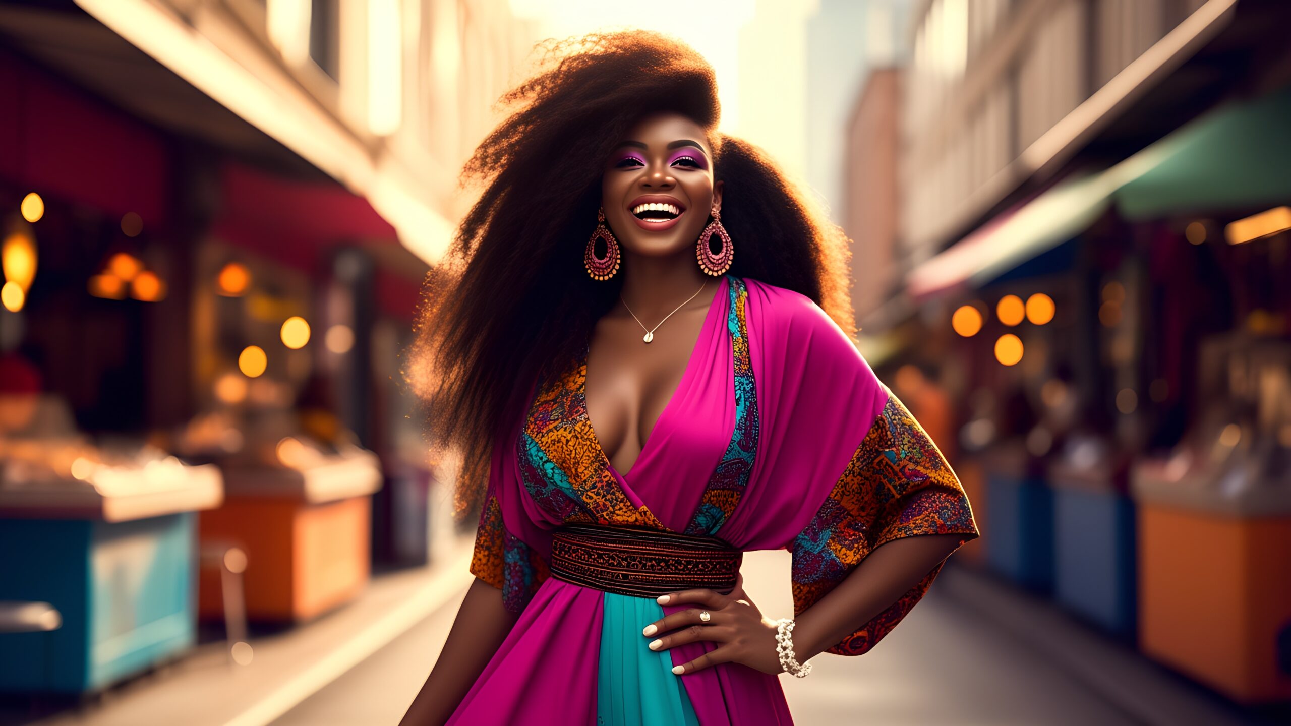 Mam pulchną, krągłą sylwetkę, którą celebruję z pewnością siebie, nosząc odważne, modne stylizacje. Moje outfity to czysta ekstrawagancja – kolorowe kombinezony, crop topy z wysokim stanem jeansów, albo obcisłe sukienki w neonowych odcieniach, zawsze z dodatkami, które kradną show: wielkie kolczyki koła, warstwowe naszyjniki i oczywiście moje własne, oszałamiające manicure z błyszczącymi wzorami czy kryształkami. Moje włosy to pole kreatywności – raz to bujny afro, raz kolorowe warkocze albo odjechany updo. Mój look mówi: „Jestem tu, by robić wrażenie!”